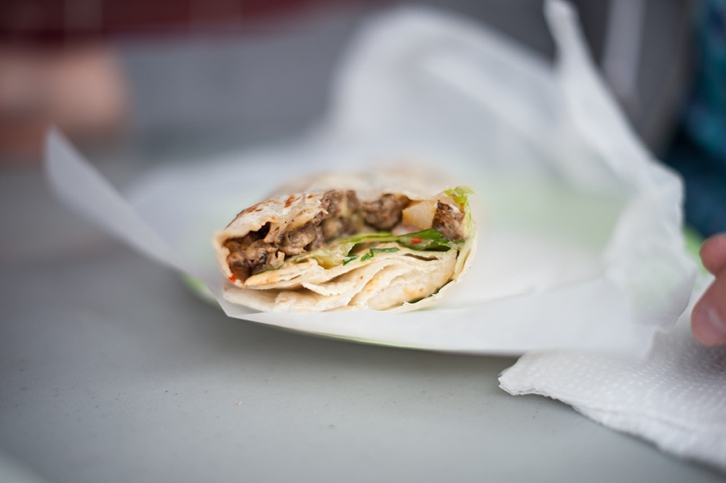 “Flour Tortilla + Carne Asada + Melted Jack/Cheddar Cheese + House cut Belgian style Fries + Mexican Cream + Chipotle Aioli + Chile de Arbol/Japanese Peanut Salsa + Lettuce”