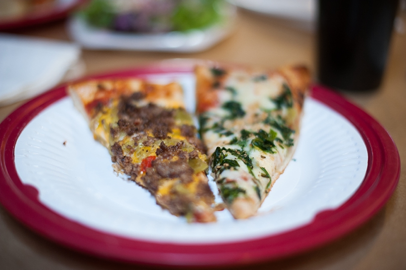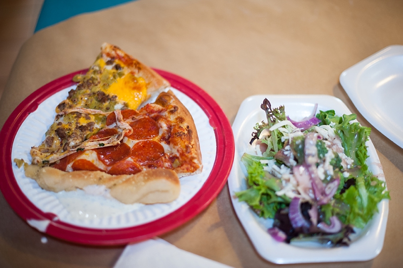 What we ate: Pepperoni/Green Chile, Pepperoni, Cheeseburger Pizza, Spinach, Breadsticks, Cinnamon Sticks, and Salad Bar.